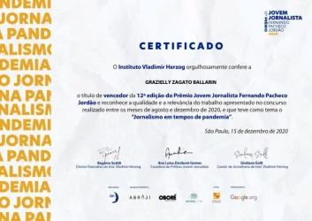 Com a reportagem "Entre o abismo & a esperança", a estudante do curso de Jornalismo do UNISAGRADO, Grazielly Zagato Ballarin e seu grupo receberam o título de vencedores da 12° edição do Prêmio Jovem Jornalista Fernando Pacheco Jordão. O evento contou com conferências com jornalistas e professores, aula magna, formação dos grupos e produção das reportagens, entrega das reportagens finalizadas e avaliação coletiva. As etapas foram realizadas entre os meses de agosto a dezembro de 2020.