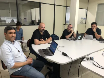 Da esquerda para a direita, Crisller Pereira, Dr. Sandro Santos, Dr. Marcelo Pinheiro, Dr. Harry Boos, Dr. Gustavo Teixeira, MSc. Estevão Souza, Dr. Sérgio Rocha, Dr. Sérgio Bueno, Fabíola Schneider e Dr. William Santana